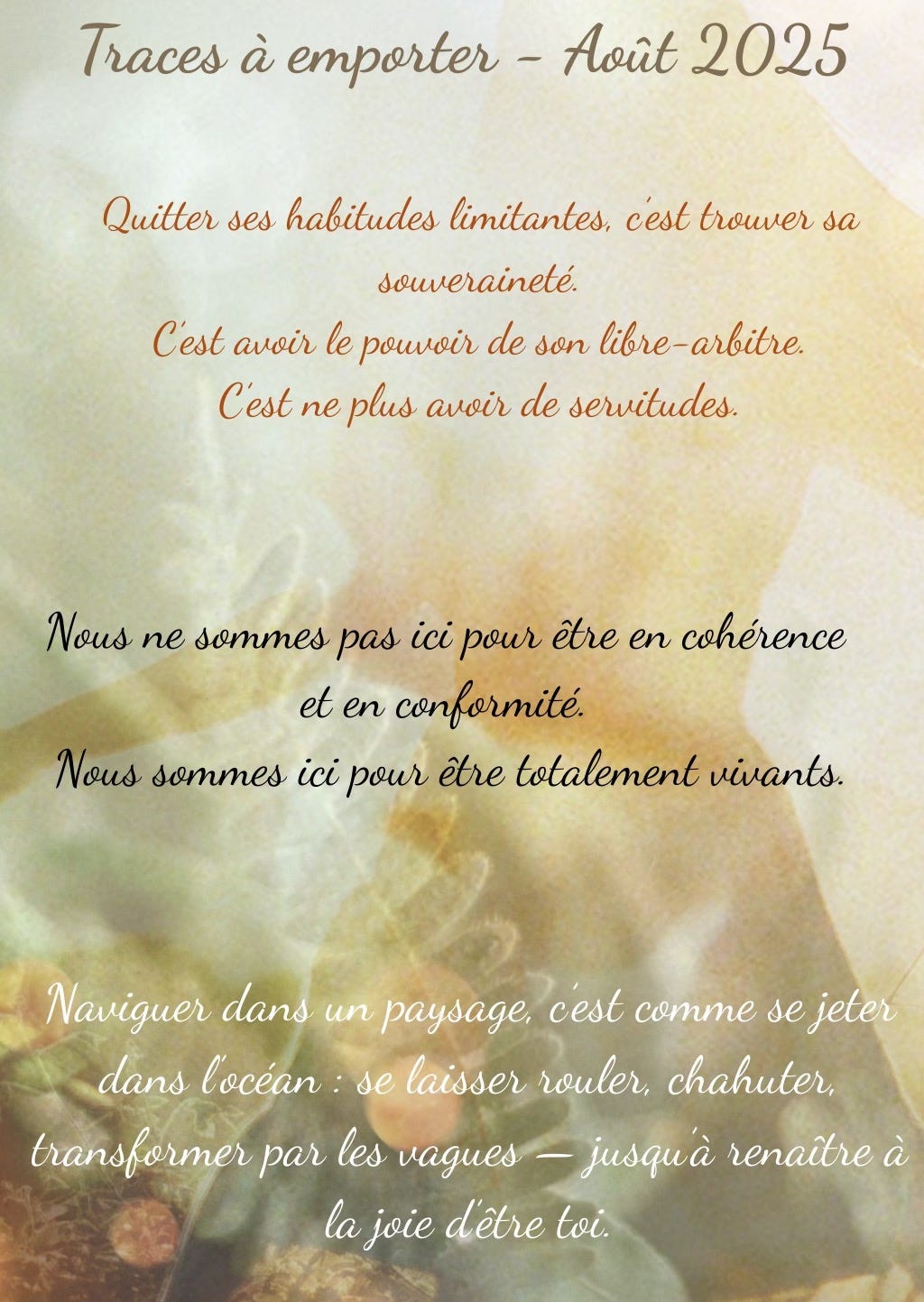 Alors, avant que le mois ne bascule, je t’invite à revisiter avec moi quelques éclats d’août : écrits, réflexions, instants de nature… qui m’ont aidée à naviguer entre effondrement joyeux et regain de liberté.